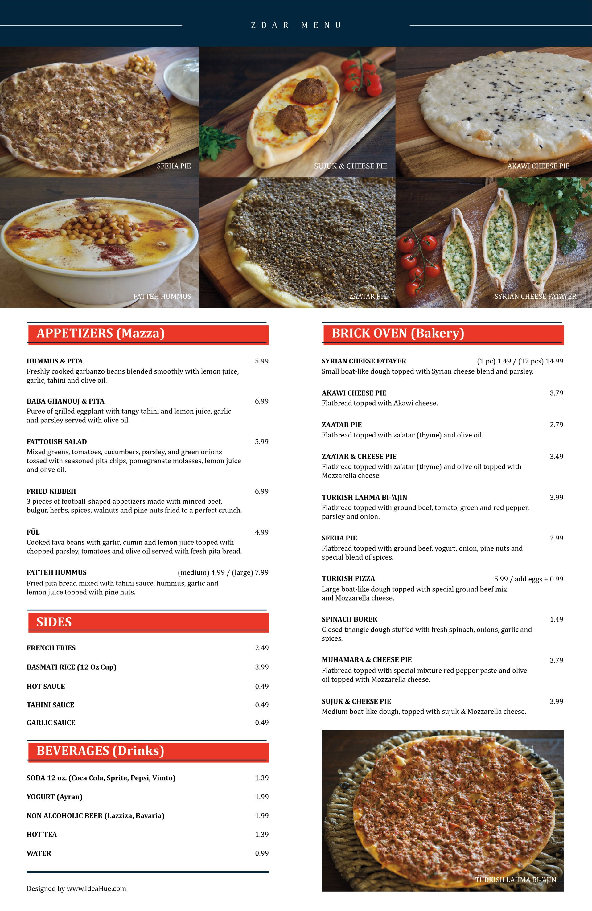 With the new ownership of Zdar Mediterranean restaurant, Idea Hue was hired to modernize the brand through a new logo identity, new food photography and style, new dine-in and takeout menu design and print, new digital menu broads, in addition to newly designed in-store marketing materials.